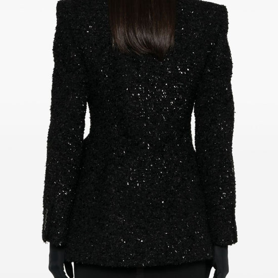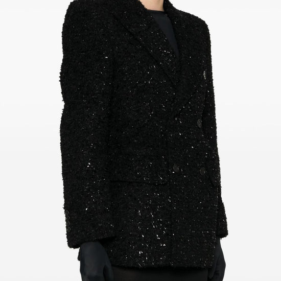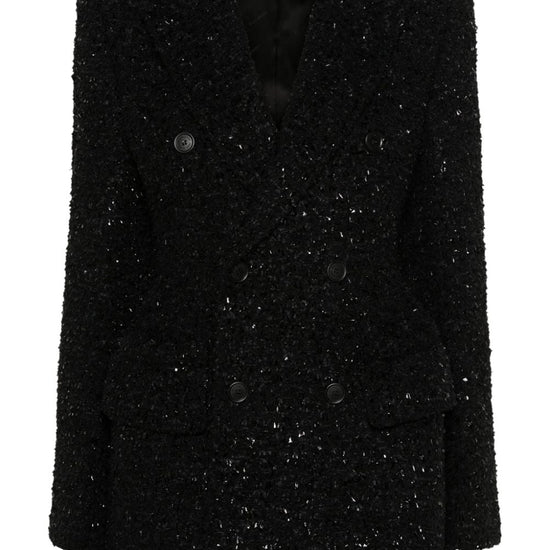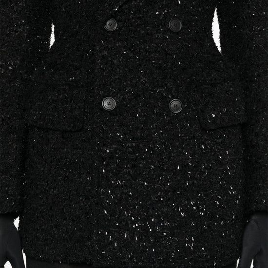 Black wool blend tweed bouclé design peak lapels shoulder pads long sleeves with buttoned cuffs two front flap pockets two side inset pockets straight hem full lining double-breasted button fastening wool blend coat size and fit - this piece fits true to size. we recommend you get your regular size. model is 1,75m / 5ft 8in wearing size 36 (fr)