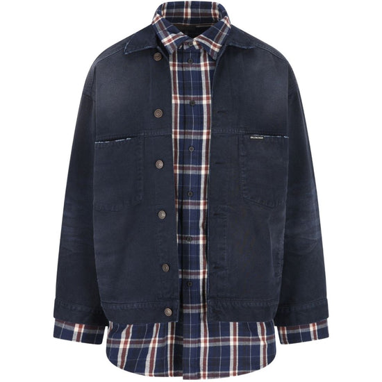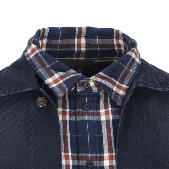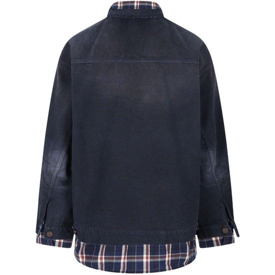 Navy blue check pattern button fastening front patch pocket buttoned cuffs collar