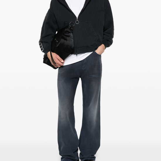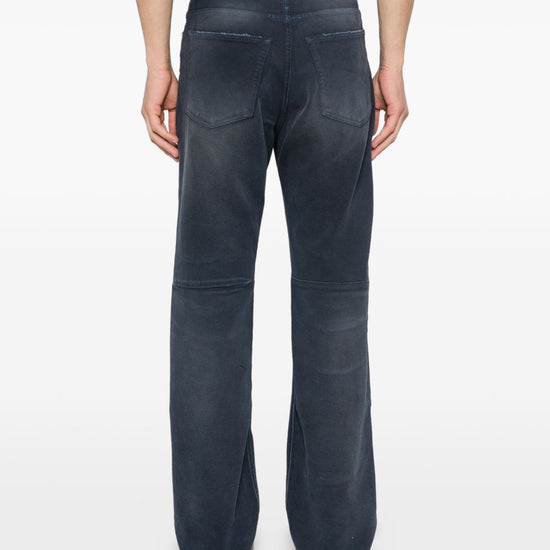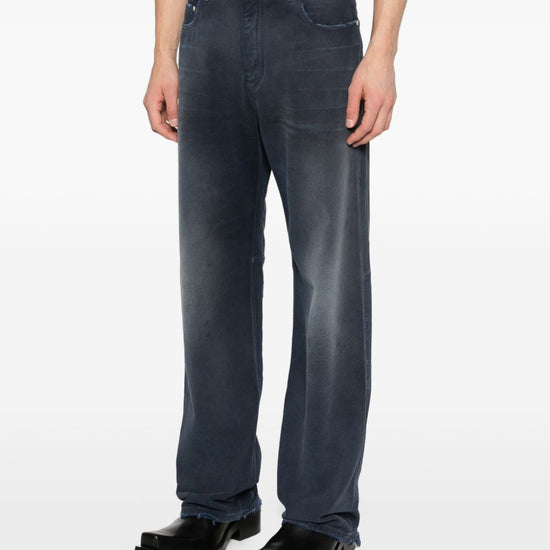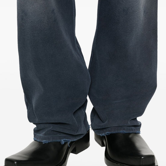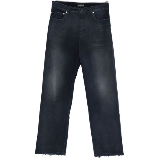 Navy blue frayed hem back patch pockets belt loops five pockets top button closure denim cotton jeans