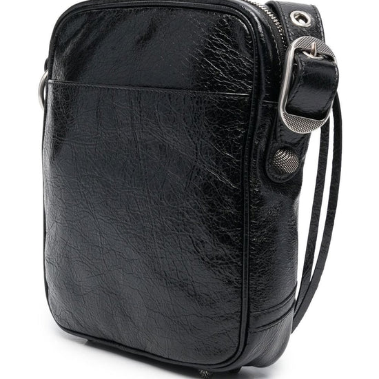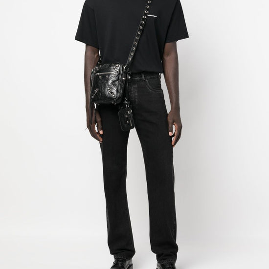Le cagole messenger bag from balenciaga featuring black, calf leather, adjustable shoulder strap, gunmetal-tone hardware, eyelet embellishment, stud detailing, front zip-fastening pocket, top zip fastening, removable airpods pro holder and removable zipped pouch. conscious: we've partnered with good on you – an ethical agency that rates how sustainably brands perform. this item comes from a brand that performs well in relation to their impact on the planet.. le cagole media le cagole leather crossbody bag size and fit - width 5,91 in / 15 cm