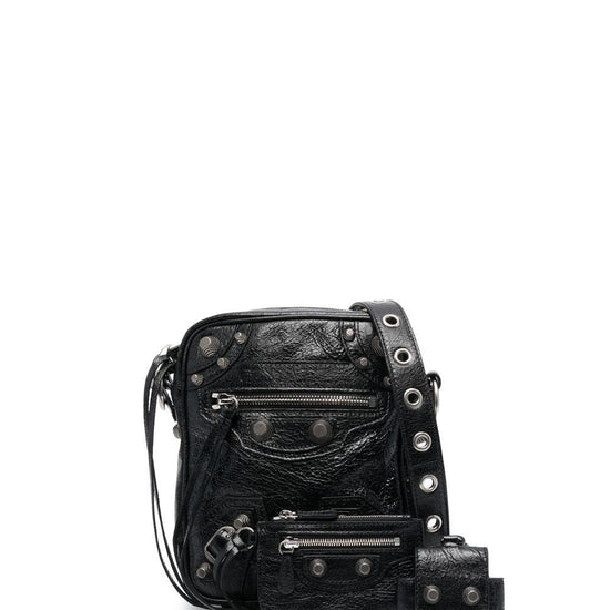 Le cagole messenger bag from balenciaga featuring black, calf leather, adjustable shoulder strap, gunmetal-tone hardware, eyelet embellishment, stud detailing, front zip-fastening pocket, top zip fastening, removable airpods pro holder and removable zipped pouch. conscious: we've partnered with good on you – an ethical agency that rates how sustainably brands perform. this item comes from a brand that performs well in relation to their impact on the planet.. le cagole leather crossbody bag size and fit - width 5,91 in / 15 cm