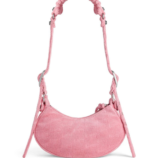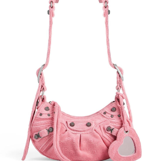 Mini le cagole shoulder bag from balenciaga featuring flamingo pink, felted finish, stud detailing, decorative buckle detailing, braid detailing, top zip fastening, main compartment, internal logo patch, mirror tag and adjustable shoulder strap. le cagole xs leather shoulder bag size and fit - width 10,24 in / 26 cm height 6,3 in / 16 cm depth 2,76 in / 7 cm