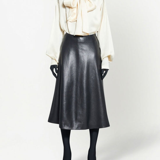 Leather midi a-line skirt from balenciaga featuring black, leather, a-line, high waist, concealed side zip fastening and mid-length. a-line leather midi skirt size and fit - this piece fits true to size. we recommend you get your regular size. model is 1,75m / 5ft 8in wearing size 36 (fr)