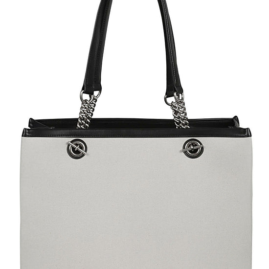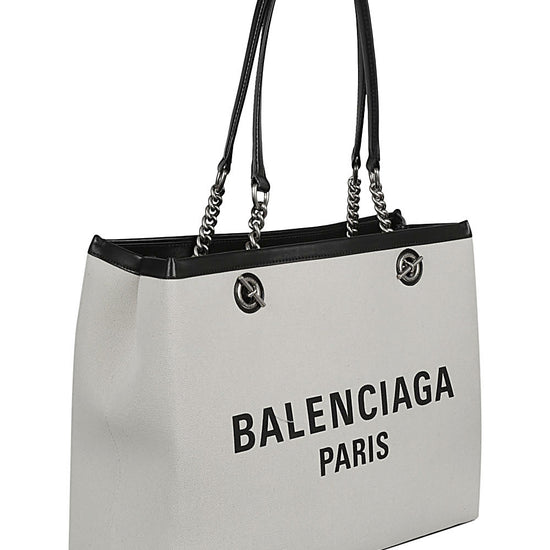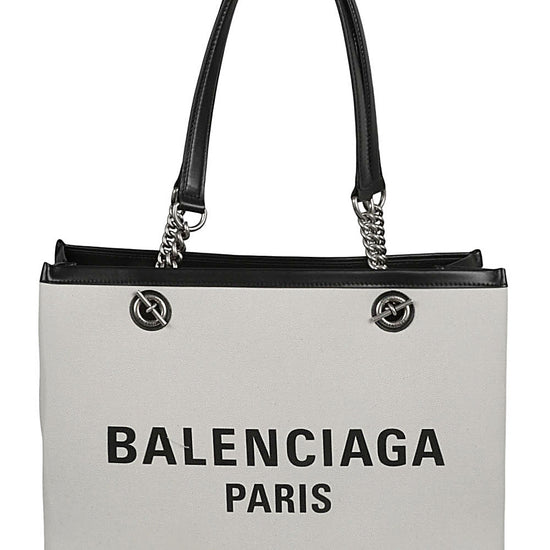 Beige shopping bag, tote bag, two handles, open upper part, ancient silver finishes, internal zip pocket, balenciaga logo printed on the front. duty free canvas tote bag size and fit - width 13,78 in / 35 cm
