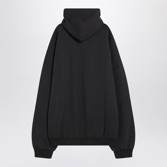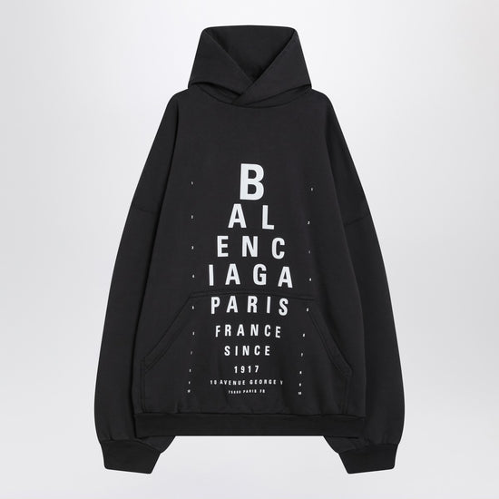 Black faded cotton hoodie by balenciaga, featuring long sleeves, a front kangaroo pocket, contrasting printed optical motif on the front, ribbed edges, and an oversized fit. size and fit - model wears size s model measurements: height: 180 cm chest: 85 cm waist: 60 cm hips: 93 cm