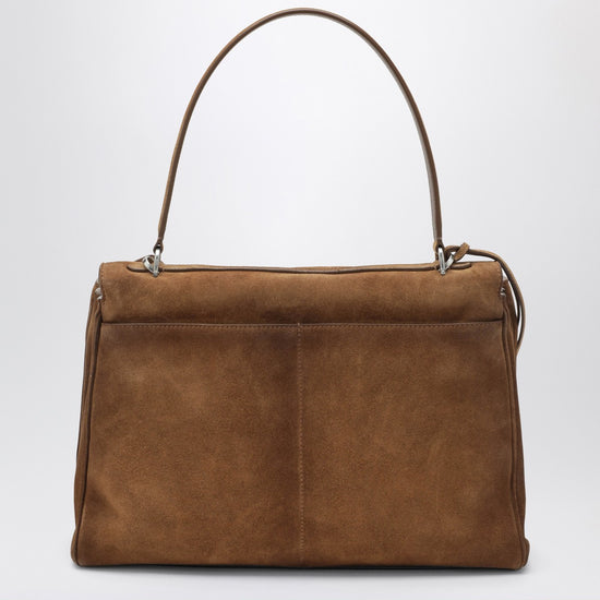 Balenciaga medium camel suede leather bag with top handle, removable shoulder strap, detachable leather keyring with two open rings, aged gold-tone hardware, twist-lock closure, main compartment, internal zip pocket, two rear flat pockets, four side snap buttons, and four metal feet. size and fit - width 35 cm x height 24 cm x depth 10 cm shoulder strap length 100 cm handle drop: 20 cm
