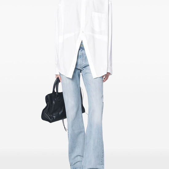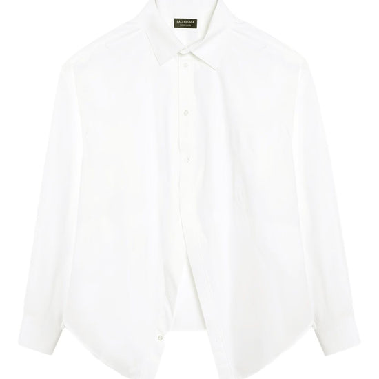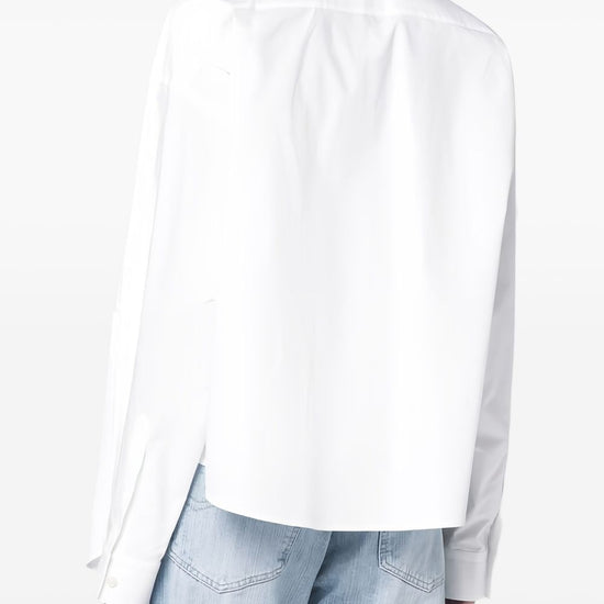 White cotton poplin shirt. features a pointed collar with tone-on-tone embroidered logos, button fastening, long v-neckline at the bottom of the front with waist detail, patch pocket on the chest, buttoned cuffs and a straight back hem. cotton shirt size and fit - this piece fits true to size. we recommend you get your regular size. model is 1,75m / 5ft 8in wearing size 36 (fr)