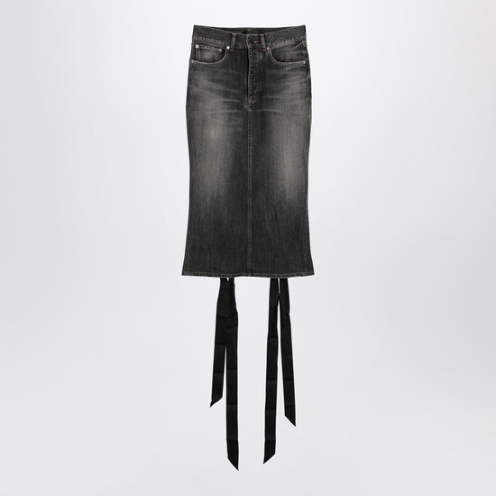 Grey washed-effect cotton denim skirt from balenciaga featuring cross-back ties, a front button placket, waist loops and a classic five-pocket design. size and fit - model wears size 36 fr model measurements: height: 178 cm chest: 89 cm waist: 62 cm hips: 88 cm