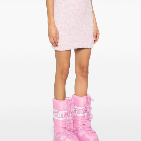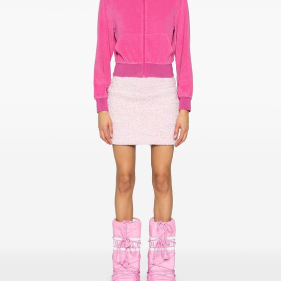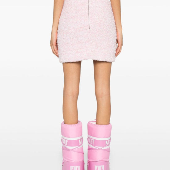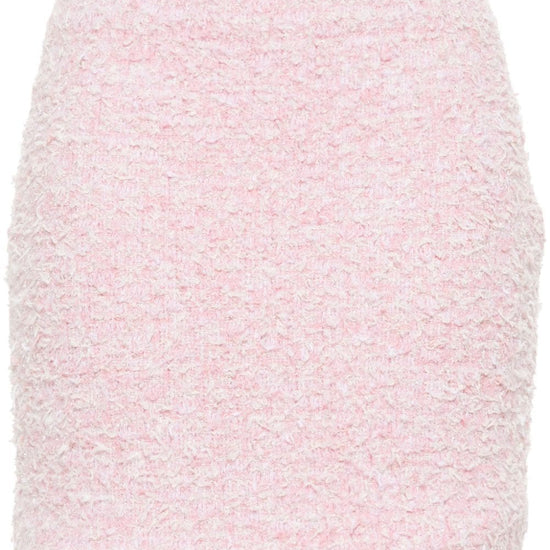 Pink cotton blend tweed bouclé design mid-rise rear zip fastening straight hem full lining tweed mini skirt size and fit - hips: 79.0 centimetres. length: 41.0 centimetres. waist: 57.0 centimetres.