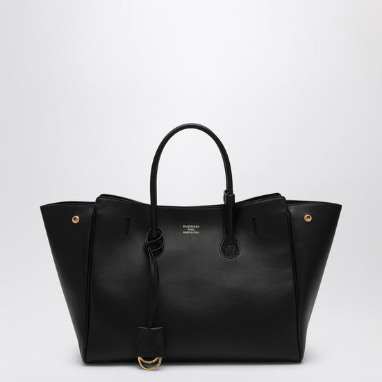 Black calfskin balenciaga handbag, featuring two leather handles, an adjustable and removable shoulder strap, embossed logo on the front, removable keychain with double spiral ring, snap buttons on the sides, magnetic closure, one internal zip pocket, two flat internal pockets, and four brass feet. size and fit - width 31 cm x height 25,5 cm x depth 16 cm handle drop: 12 cm