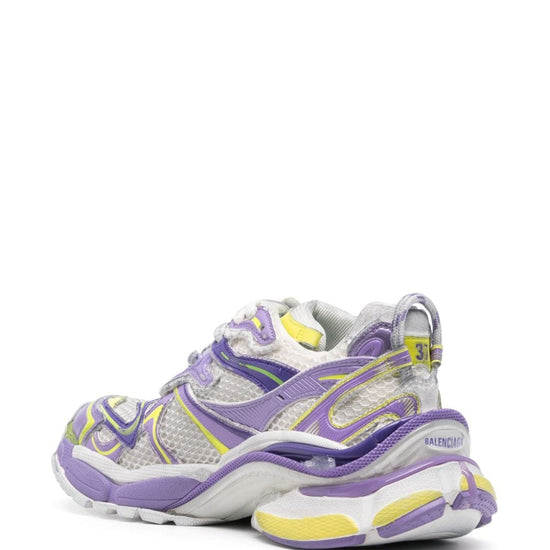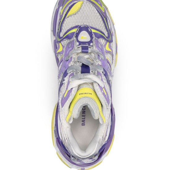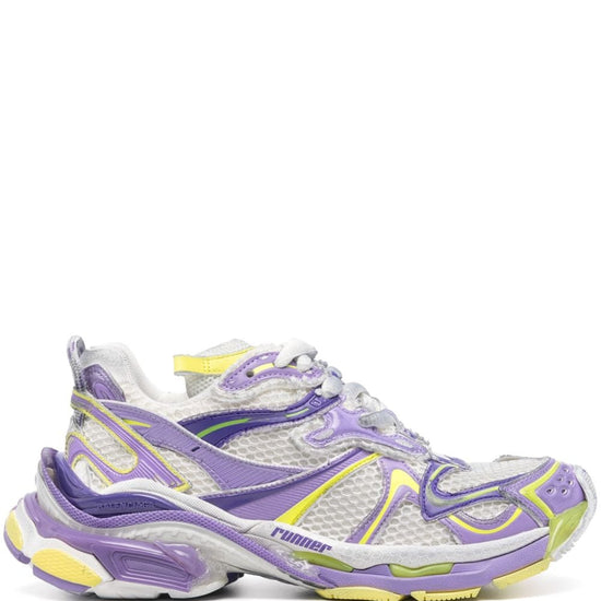 Lilac purple/fluorescent yellow multi-panel design distressed finish mesh panelling logo patch at the tongue logo patch to the front logo print to the side printed size at the edge of the toe debossed size at back branded heel counter pull-tab at the heel front lace-up fastening round toe branded insole chunky rubber sole runner 2 sneakers size and fit - heel 2 in / 5 cm, platform 1 in / 2,5 cm