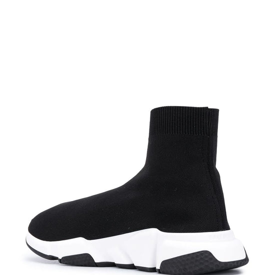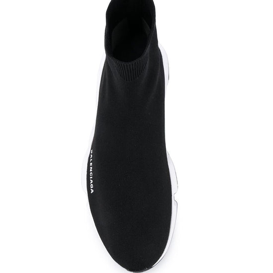 Black speed lt sneakers from balenciaga featuring round toe, knitted construction, logo print to the side, flat rubber sole, elasticated ankle and pull-on style. speed speed sneakers size and fit - heel 1,6 in / 4 cm; platform 0,4 in / 1 cm