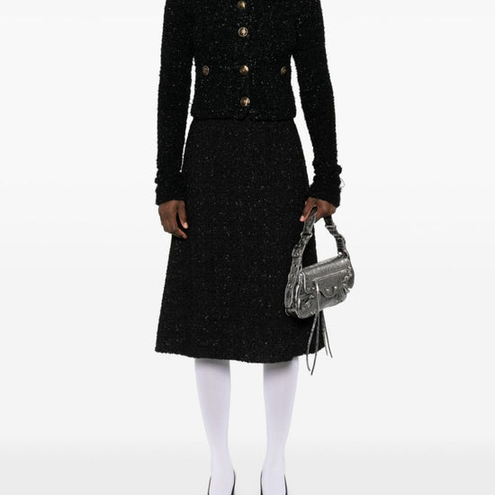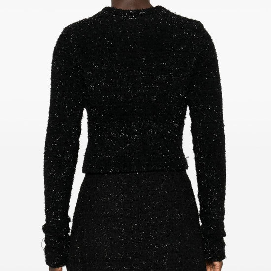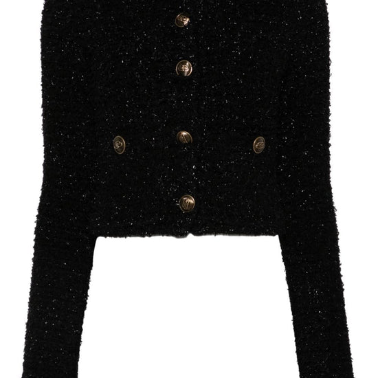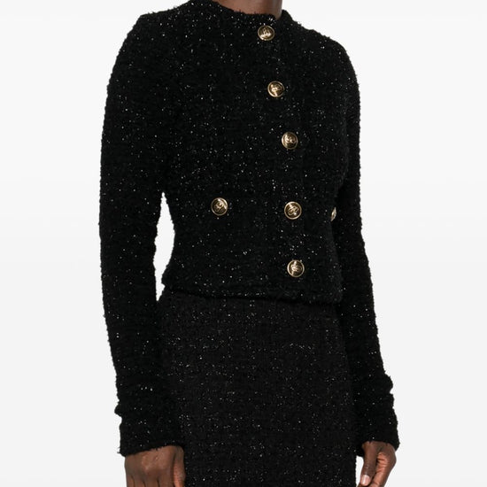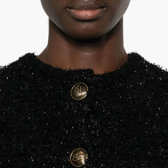 Black cotton blend bouclé construction metallic threading crew neck long sleeves two front patch pockets logo-embossed buttons cropped full lining straight hem front button fastening bouclé cropped jacket size and fit - bust: 68.0 centimetres. length: 44.0 centimetres. waist: 64.0 centimetres. sleeve length: 78.0 centimetres. shoulder width: 36.0 centimetres.