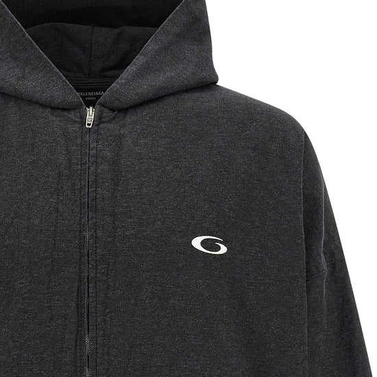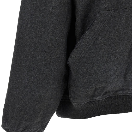'trompe l'œil' used-effect mélange cotton denim hoodie with stretch ribbed knit inserts, 'loop sports icon' embroidery and front zip closure, pockets, long cuffed sleeves and dropped shoulders. size and fit - large fit