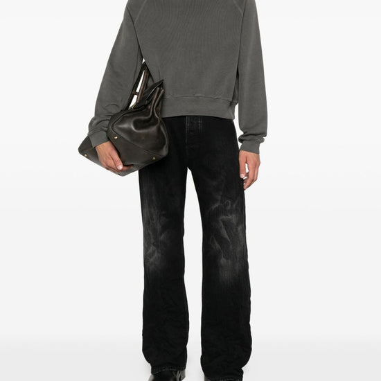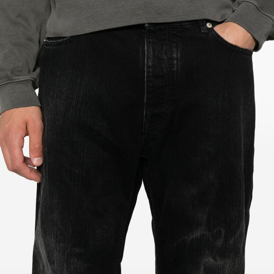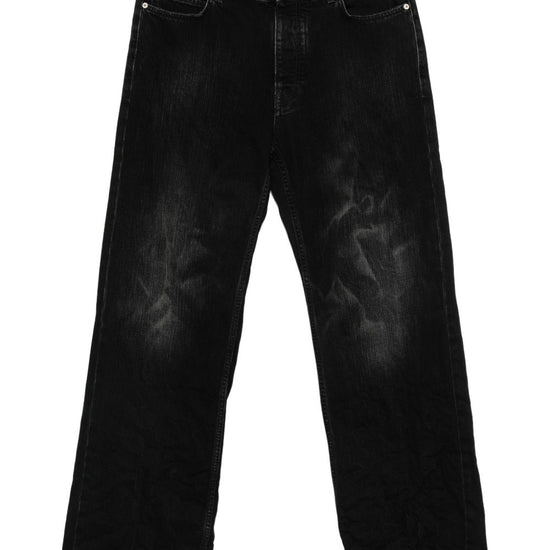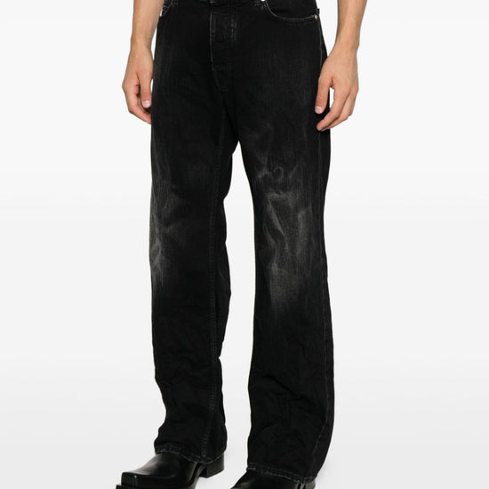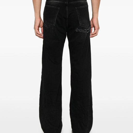 Black button fastening five pockets tonal stitching belt loops faded effect distressed denim jeans