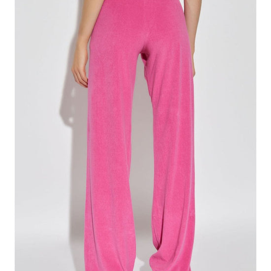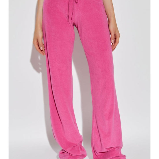 Pink cotton blend drawstring fastening elasticated waistband long length velvet trousers size and fit - front rise: 20.3 centimetres. inside leg: 96.5 centimetres. hips: 104.1 centimetres. waist: 81.3 centimetres.