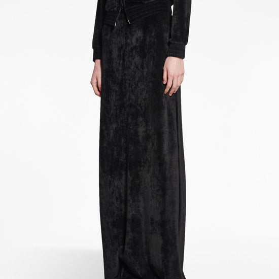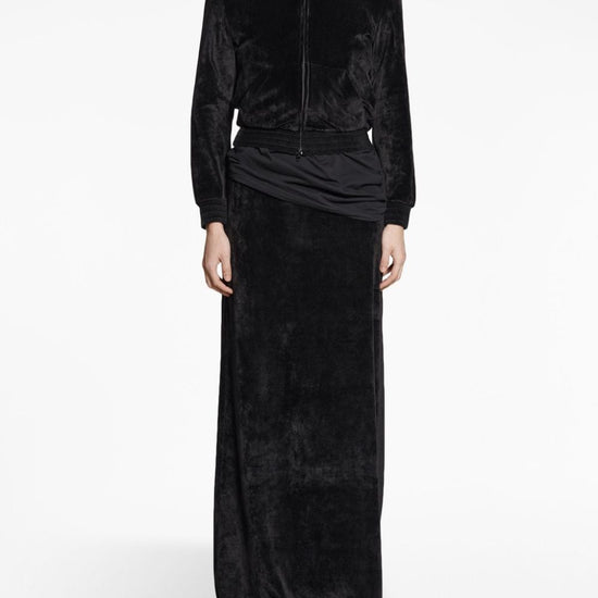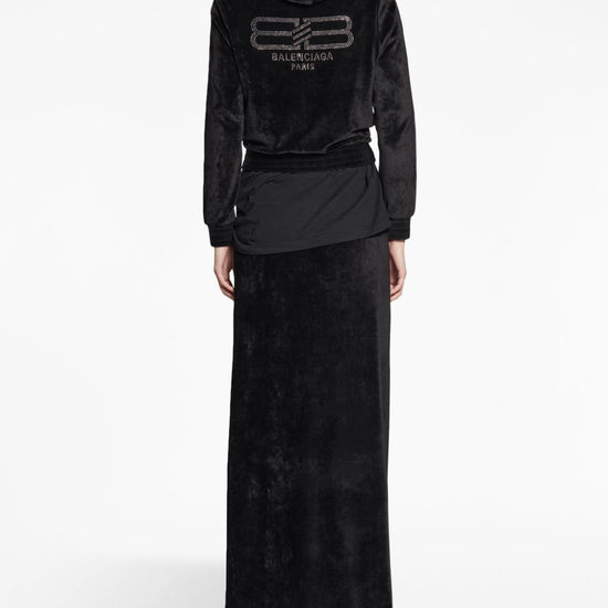 Velvet-effect high-waisted skirt from balenciaga featuring black, velvet effect, high-waisted, straight hem and floor-length. we've partnered with good on you — an independent agency that rates how brands perform in relation to their impact on the planet, people and animals, with a multi-criteria rating simplified to a five points scale. in order to be awarded our conscious label, larger brands need to score a minimum of four out of five ('good'), while smaller brands must score at least three out of five ('it's a start'). this item comes from a brand rated four out of five ('good') by good on you. please note, this is a brand-level rating and does not guarantee that this product is made with conscious materials.. learn more about what makes a product conscious on our conscious criteria page. maxi velvet maxi skirt size and fit - this piece fits true to size. we recommend you get your regular size. model is 1,75m / 5ft 8in wearing size 36 (fr)