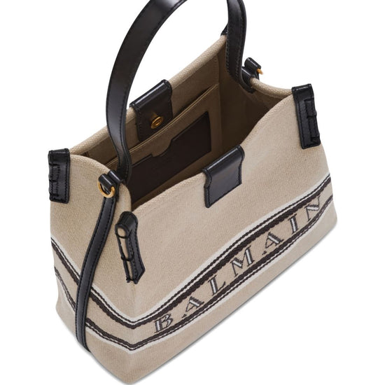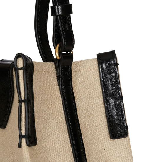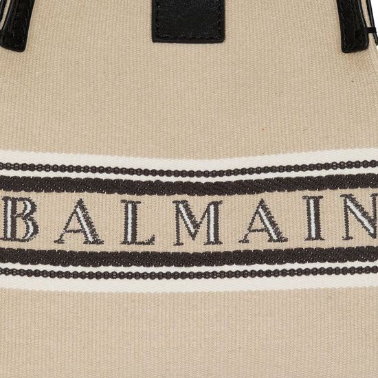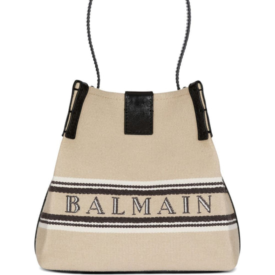 Beige striped detail top handle detachable shoulder strap front logo press-stud fastening release canvas and leather bucket bag
