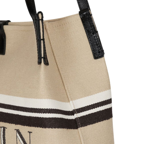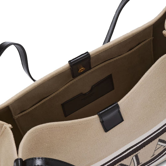 Beige logo lettering top handles internal slip pocket release canvad and leather medium tote