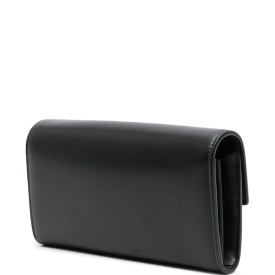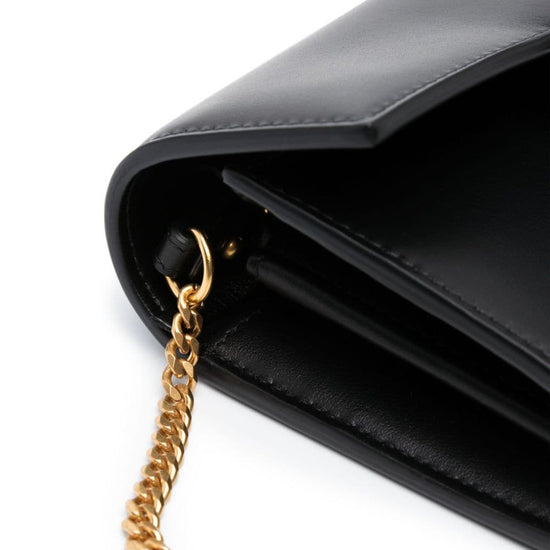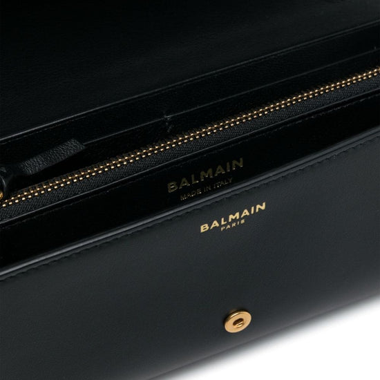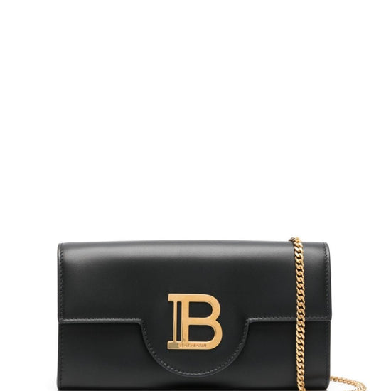Jet black lambskin smooth grain gold-tone logo plaque logo-engraved gold-tone hardware foldover top with press-stud fastening detachable chain-link shoulder strap main compartment internal logo stamp partitioned compartment internal zip-fastening pocket internal card slots leather lining gold-tone hardware b-buzz leather wallet on chain