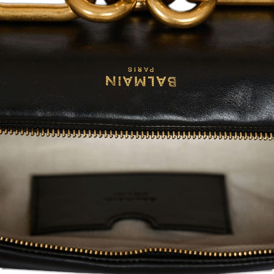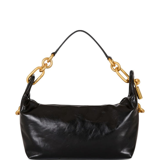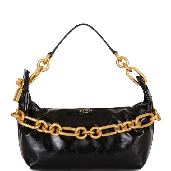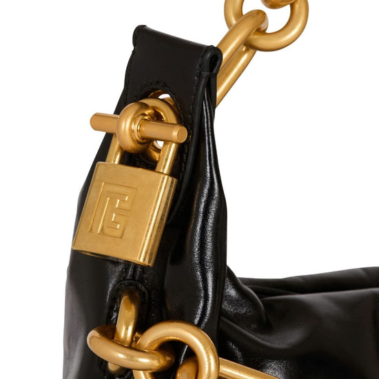 Black calfskin leather gold-tone chain strap padlock detail flap closure embossed logo sync medium leather shoulder bag size and fit - width 28cm, height 14,5cm,