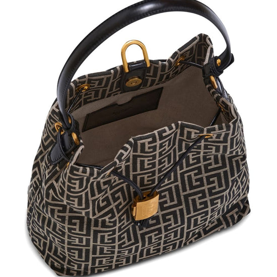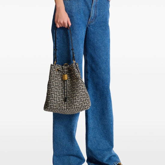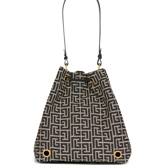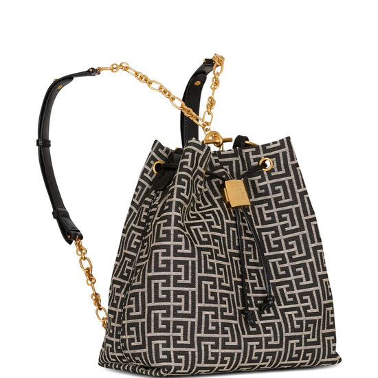 Black and beige monogram pattern gold-tone hardware drawstring fastening detachable top handle sync monogram backpack