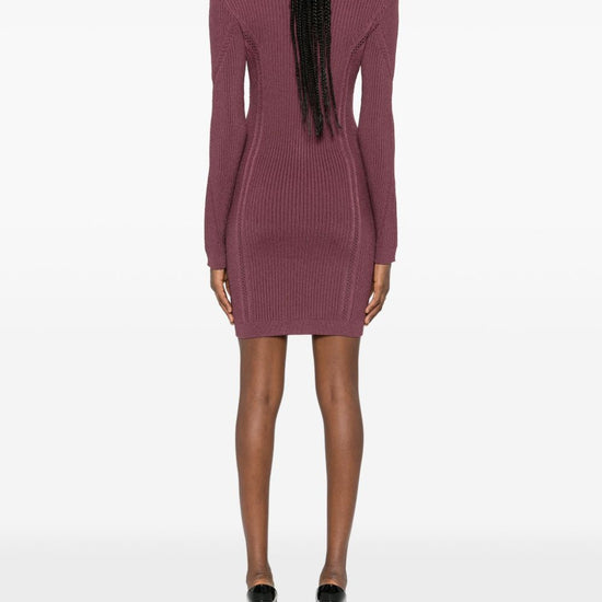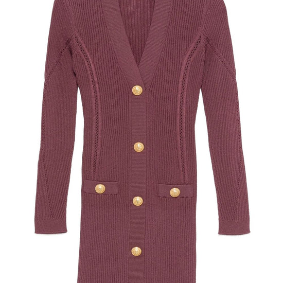 Dark violet ribbed knit v-neck two front pockets front button fastening v-necked short dress