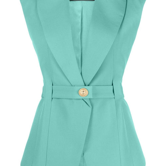 Belted-waist sleeveless jacket from balmain featuring green, cotton, peak lapels, sleeveless and belted waist. sleeveless belted wool jacket size and fit - this piece fits true to size. we recommend you get your regular size. model is 1,75m / 5ft 8in wearing size 36 (fr)