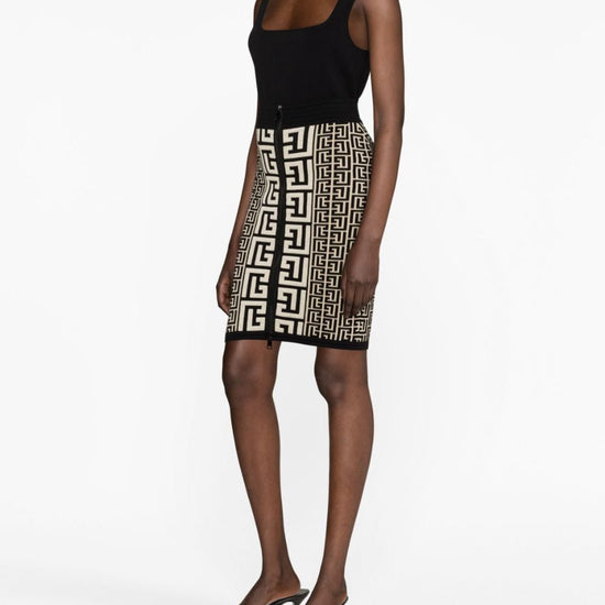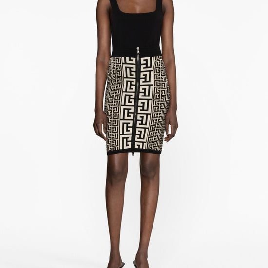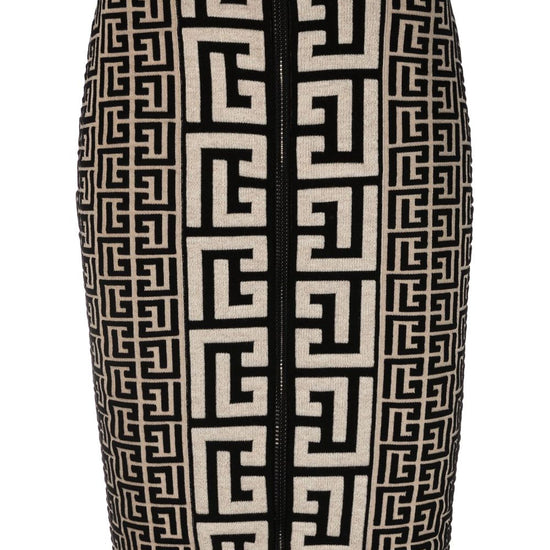 Intarsia-knit midi skirt from balmain featuring wool blend, intarsia knit, monogram pattern, wool blend, high waist, two-way zip fastening, straight hem and black/beige. monogram monogram high waist skirt size and fit - this piece fits true to size. we recommend you get your regular size. model is 1,75m / 5ft 8in wearing size 36 (fr)