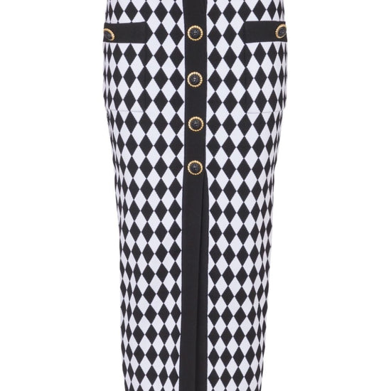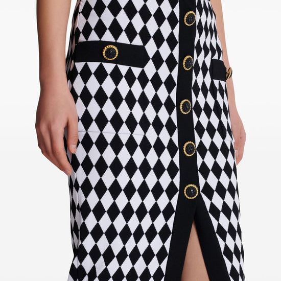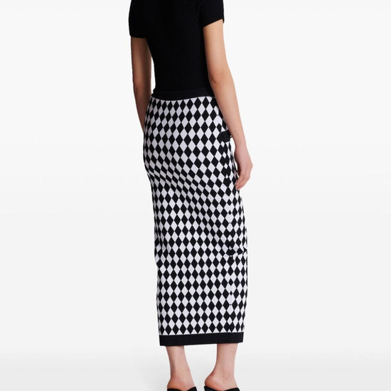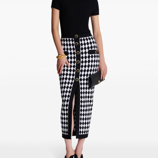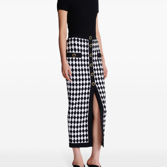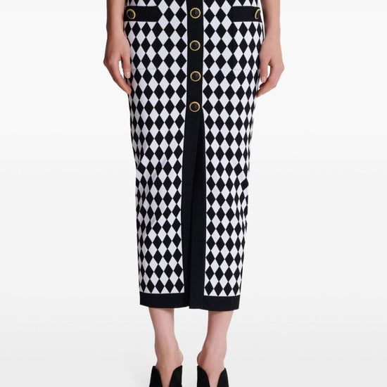 Black/white knitted construction diamond pattern patterned intarsia knit decorative button detailing elasticated waistband front slit below-knee length straight hem buttoned midi skirt size and fit - this piece fits true to size. we recommend you get your regular size. model is 1,75m / 5ft 8in wearing size 36 (fr)