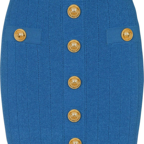 Buttoned-short-knit-pencil-skirt from balmain featuring blue, knitted construction, pencil silhouette, embossed gold-tone buttons, decorative button detailing, front flap pockets and short rear zip fastening. embossed-buttons knit mini skirt size and fit - this piece fits true to size. we recommend you get your regular size. model is 1,75m / 5ft 8in wearing size 36 (fr)