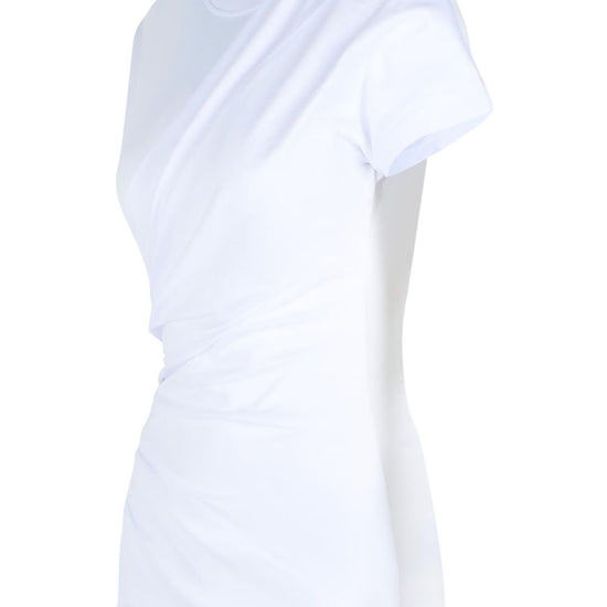 White ribbed crew neck shoulder buttons draped front knotted cotton t-shirt
