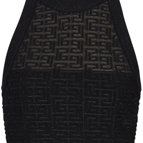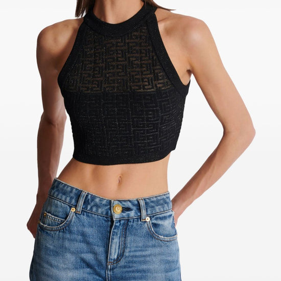 Black open knit signature 4g motif metallic threading halterneck sleeveless cropped straight hem monogram halterneck top size and fit - this piece fits true to size. we recommend you get your regular size. model is 1,75m / 5ft 8in wearing size 36 (fr)
