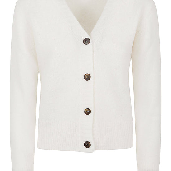 White colour, solid colour, v-neck, long sleeves, front button closure, straight hem. wool v-necked cardigan size and fit - this piece fits true to size. we recommend you get your regular size. model is 1,75m / 5ft 8in wearing size 40 (it)