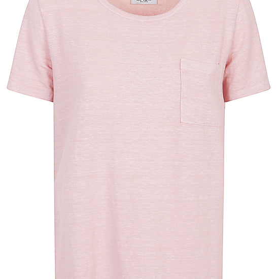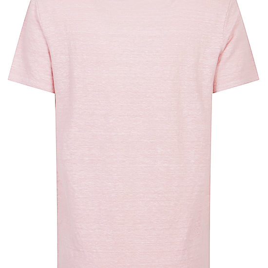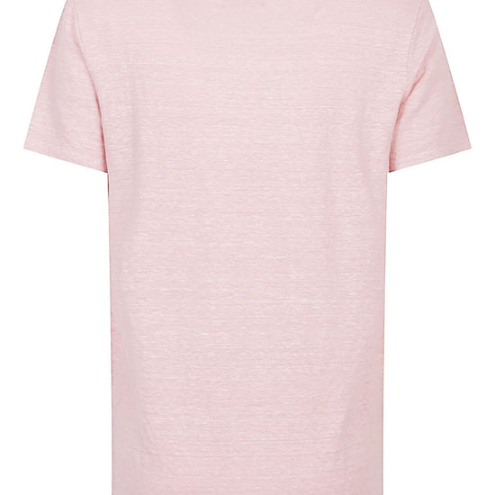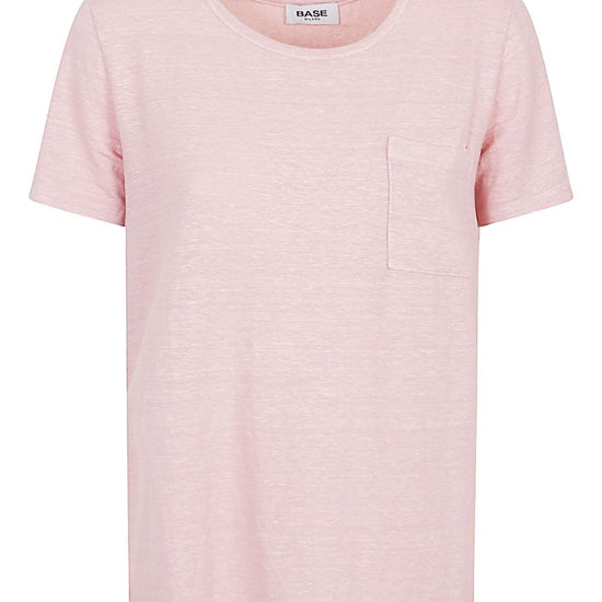 Pink t-shirt, half sleeves, crew neck, patch pocket on the chest, straight hem. linen t-shirt size and fit - this piece fits true to size. we recommend you get your regular size. model is 1,75m / 5ft 8in wearing size 40 (it)