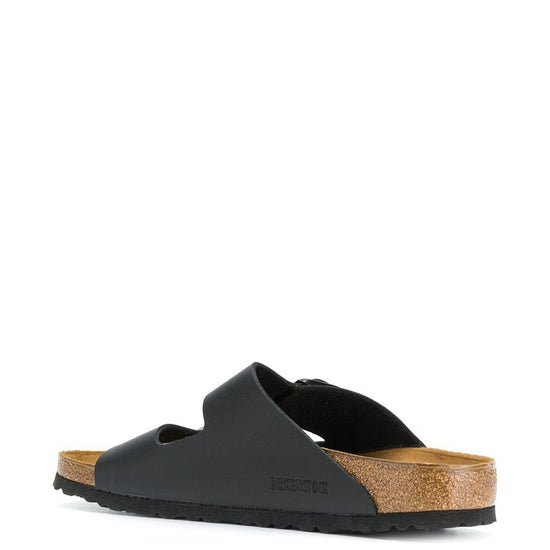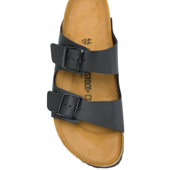 Black faux leather double buckle fastening double-strap design round open toe suede lining branded leather insole anatomically-moulded cork footbed eva outsole arizona sandals size and fit - narrow fit