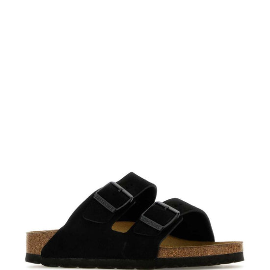 Black/brown suede debossed logo to the side round open toe two buckle-strap fastenings branded footbed flat rubber sole arizona suede leather sandals size and fit - narrow width