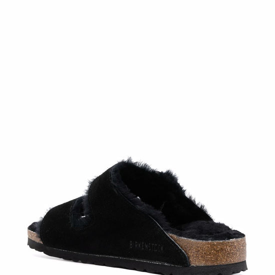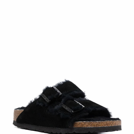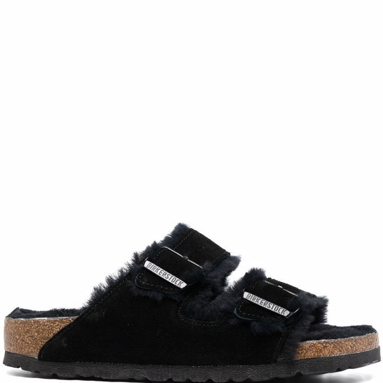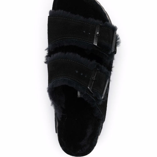 Black suede open toe side buckle fastening shearling lining branded insole rubber sole arizona shearling suede sandals size and fit - narrow width