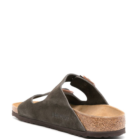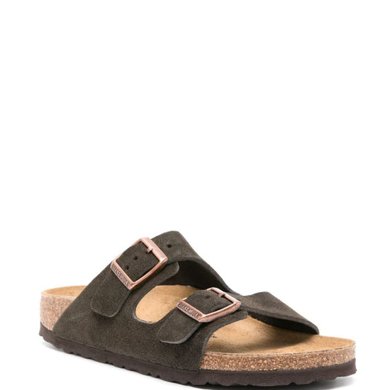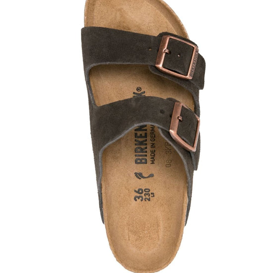 Brown suede round open toe logo-engraved buckle-strap fastening branded cork footbed flat rubber sole bronze-tone hardware arizona sandals size and fit - narrow fit