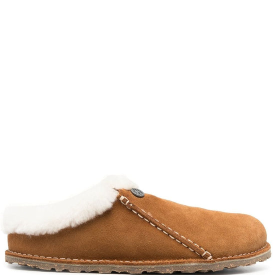 Camel brown calf suede shearling lining silver-tone logo plaque debossed logo to the side removable insole open back slip-on style flat rubber sole zermatt suede leather slippers size and fit - heel 0,4 in / 1 cm