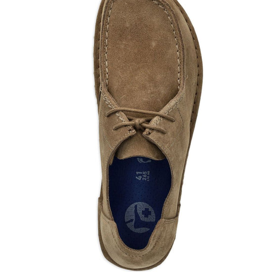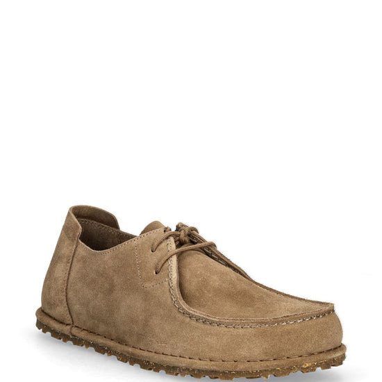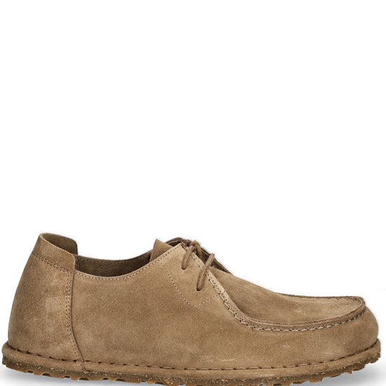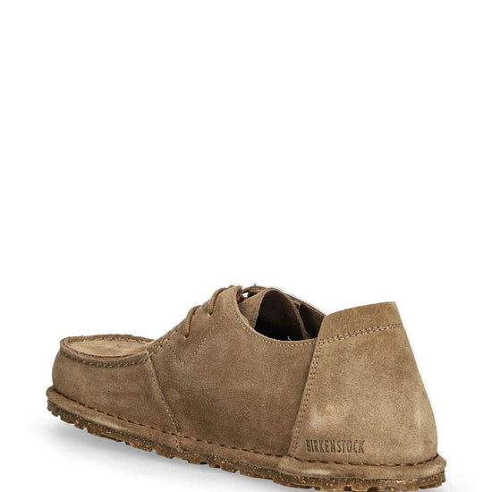 Taupe suede front lace-up fastening debossed logo to the side round toe rubber sole utti suede leather sneakers size and fit - narrow width