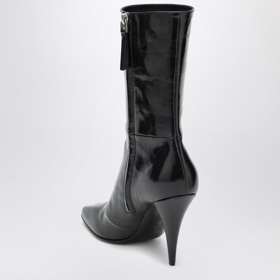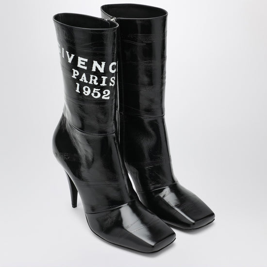 Givenchy ankle boots in black polished calfskin, featuring tape logo lettering printed on the upper of the right shoe. square toe. curved conical heel. zip closure with embossed givenchy signature zipper pull on the inner side. heel height: 9.5 cm. comfortable model. size and fit - heel 9,5 cm