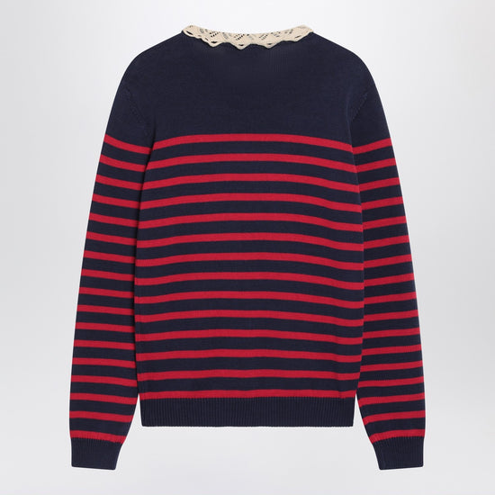 Valentino''s blue cotton sweater with red stripes, featuring a round neck with ruffles, long sleeves, a contrasting chez valentino intarsia on the front, and ribbed edges. size and fit - model wears size s model measurements: height: 179 cm chest: 82 cm waist: 65 cm hips: 90 cm