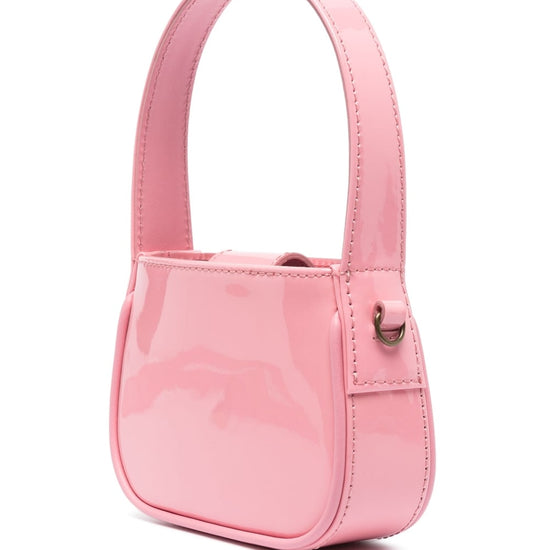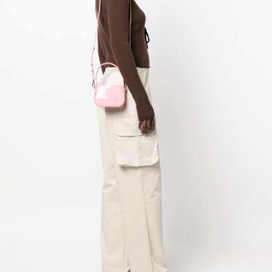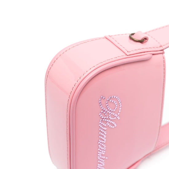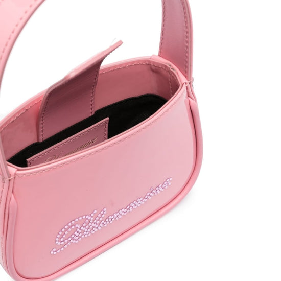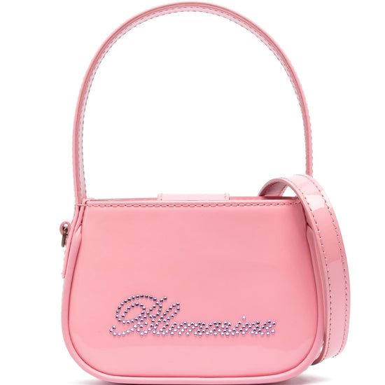 Crystal-embellished logo tote bag from blumarine featuring crystal embellishment, single flat top handle, top zip fastening, adjustable shoulder strap, rose pink, cotton and patent calf leather. logo patent leather handbag size and fit - width 5,51 in / 14 cm