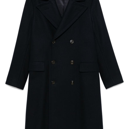 Midnight blue virgin wool blend felted double-breasted button fastening notched lapels long sleeves two side flap pockets adjustable strap to the rear box-pleat detail satin lining straight hem wool and cashmere double-breasted coat