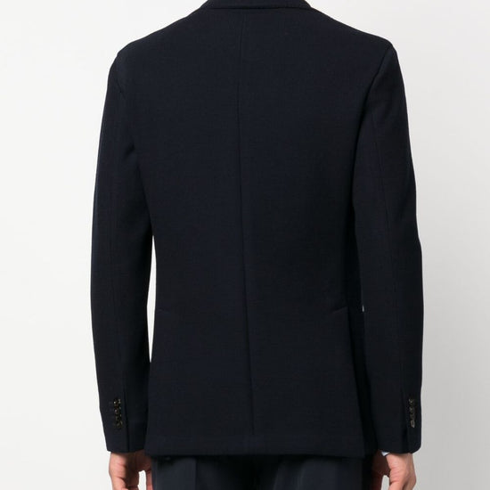Navy blue virgin wool-cotton blend notched lapels front button fastening jetted chest pocket two front patch pockets long sleeves buttoned cuffs straight hem english rear vents internal logo patch two interior pockets wool blend single-breasted jacket
