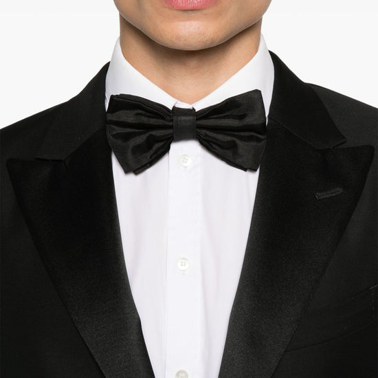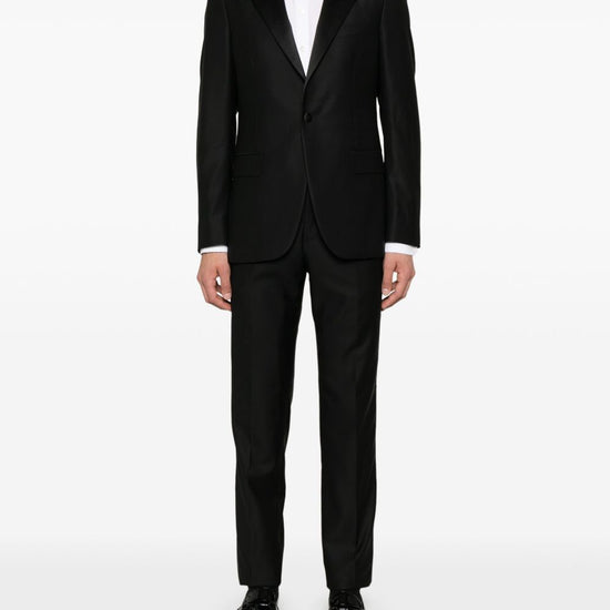 Black virgin wool blend set of two blazer satin trim peak lapels shoulder pads long sleeves buttoned cuffs chest welt pocket two front flap pockets english rear vents internal jetted pockets full lining curved hem trousers front button and zip fastening coin pocket two side slash pockets satin trim two rear jetted pockets tailored cut tapered leg wool single-breasted suit