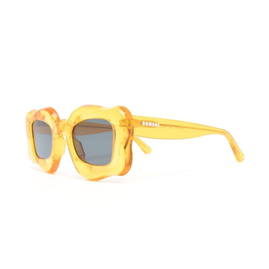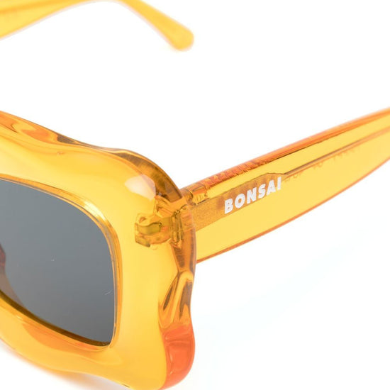 Oversized curved-frame sunglasses from bonsai featuring orange, transparent design, oversize frame, curved corners, tinted lenses, logo print at the arm and straight arms. these glasses come with a protective case.. happy sunglasses size and fit - arm length: 14.5 centimetres. bridge width: 2.7 centimetres. lens diameter: 4.8 centimetres. total width: 13.5 centimetres.