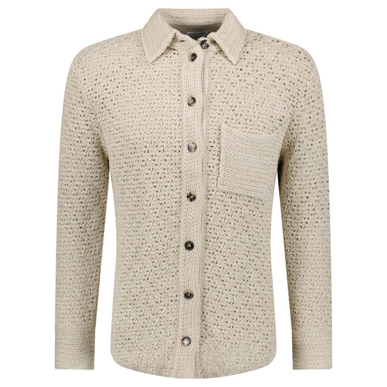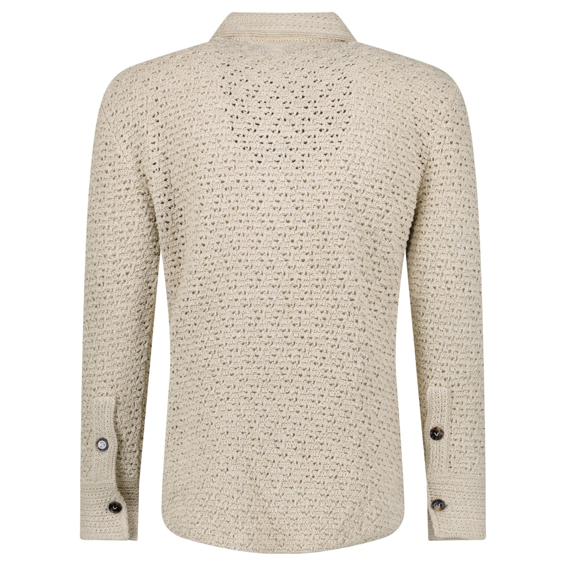 elevate your wardrobe with the bottega veneta cotton crochet shirt in beige. crafted from 100% cotton, this refined open-knit shirt delivers airy comfort with an artisanal finish. featuring a point collar, full button placket and a chest patch pocket, it blends relaxed texture with tailored detailing. ideal layered over a tee or styled solo with tailored trousers, it brings a quietly luxurious edge to any outfit.