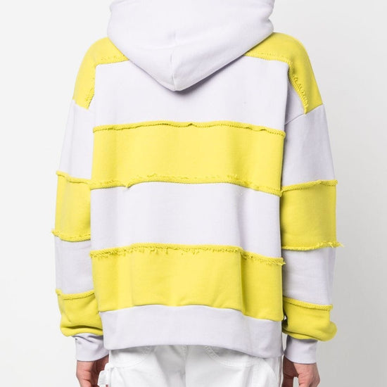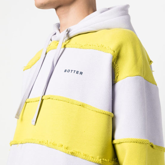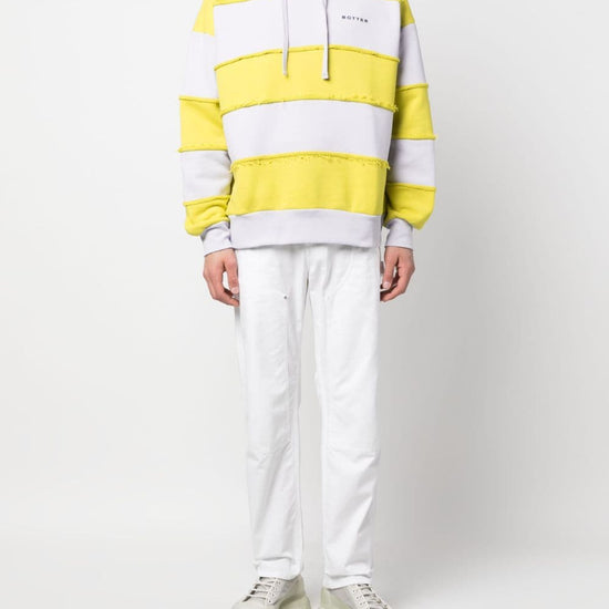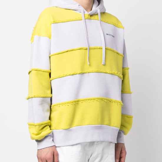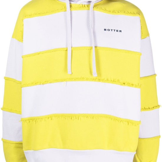 Striped drawstring hoodie from botter featuring citron yellow, white, organic cotton, stripe print, logo print at the chest, drawstring hood, long sleeves and ribbed cuffs and hem. conscious: this product contains organic cotton where the cultivation and manufacturing process restricts the use of chemicals, eliminates pesticides or artificial fertilisers and incorporates methods that respect biodiversity, improve soil quality, and reduce water consumption.. learn more about what makes a product conscious on our conscious criteria page. a righe organic cotton hoodie size and fit - this piece fits true to size. we recommend you get your regular size. model is 1,84m / 6ft 1in wearing size m